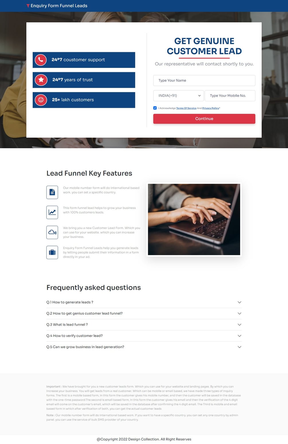 Inquiry Form Funnel Leads Generation provides an easy way for people to fill in contact information on the landing page. In which the lead will be 100% accurate because before getting the lead in it, the mobile number and email There will be verification that will prove that the leads you get are 100% accurate. Which will prove to be very helpful in increasing your business.