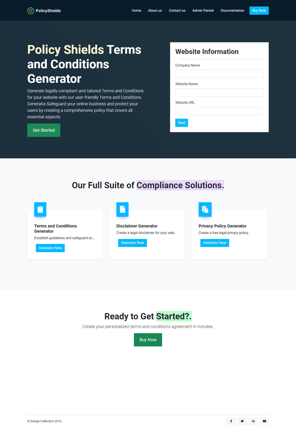 Policy Shields is a comprehensive and user-friendly web application that empowers website owners and businesses to effortlessly generate essential legal documents, manage website settings, and optimize their online presence. This all-in-one platform combines the functionality of generating Terms and Conditions, Privacy Policy, and Disclaimer with various other features to enhance website management and customization.