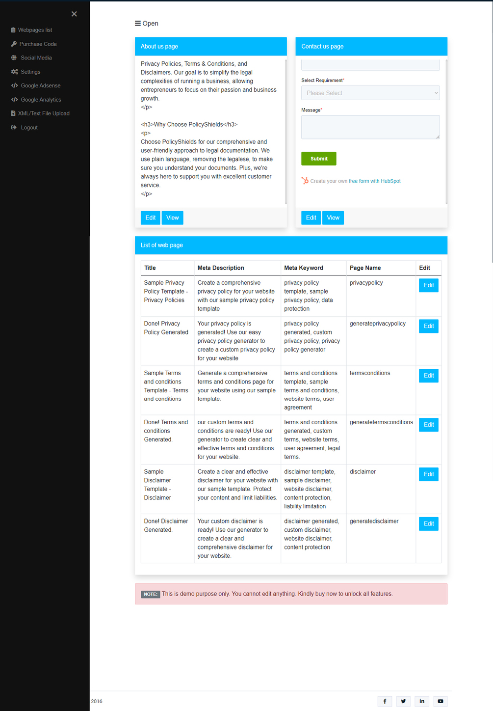 Policy Shields is a comprehensive and user-friendly web application that empowers website owners and businesses to effortlessly generate essential legal documents, manage website settings, and optimize their online presence. This all-in-one platform combines the functionality of generating Terms and Conditions, Privacy Policy, and Disclaimer with various other features to enhance website management and customization.LIVE PREVIEW